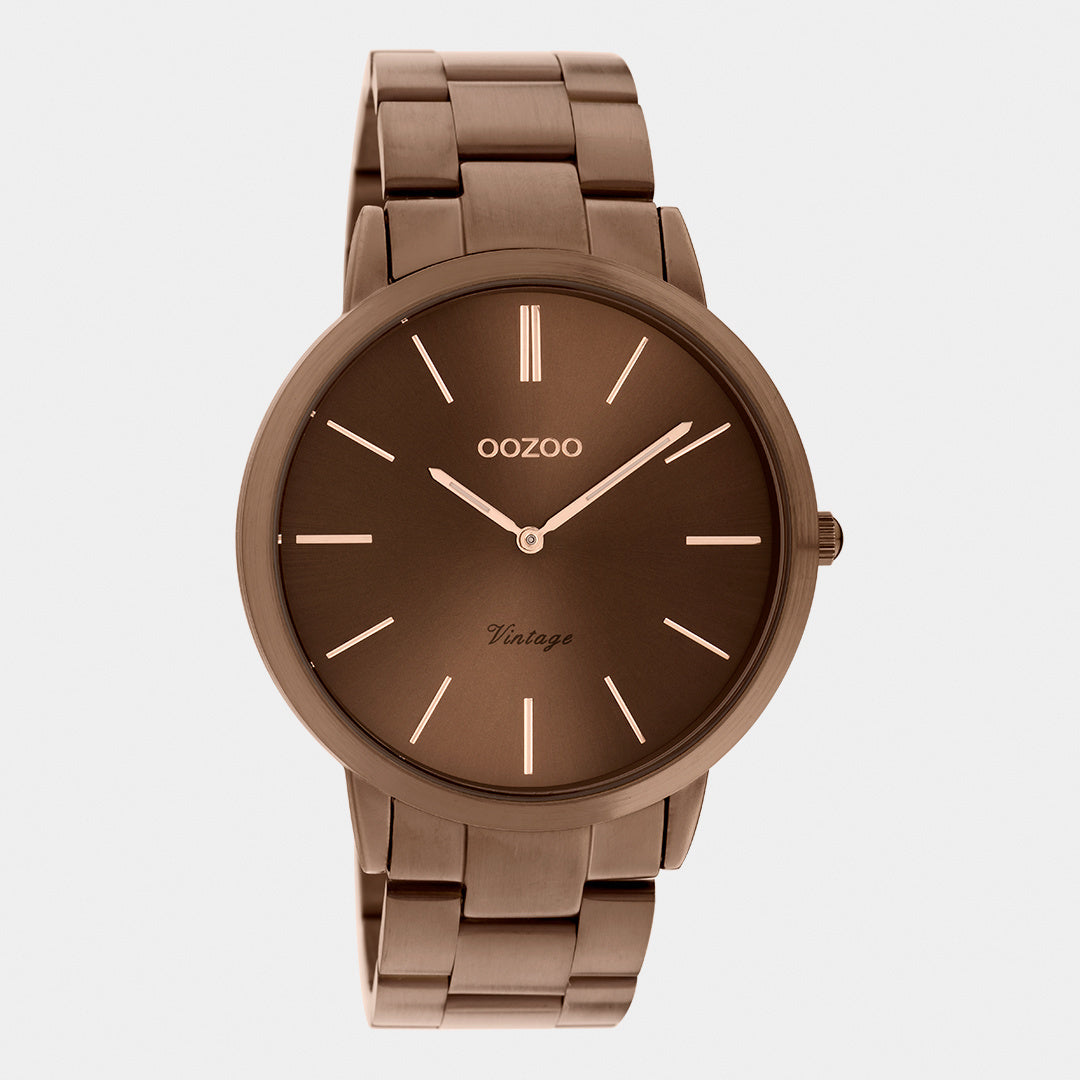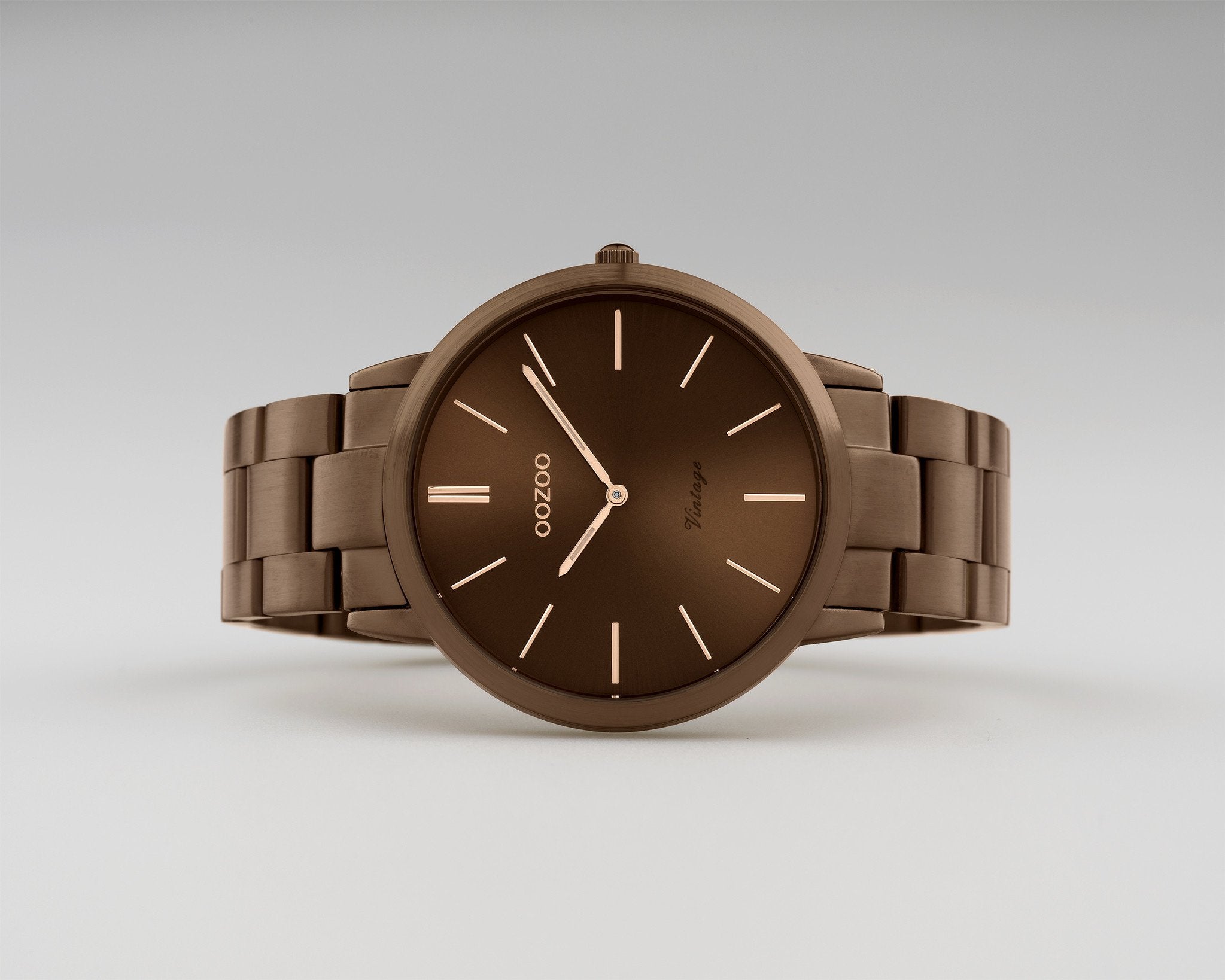Für das neue Jahrzehnt haben wir die Next Generation-Kollektion als Erweiterung der OOZOO Vintage-Serie kreiert. Bei diesem klassische runde Design der C20103 mit einem zeitgemäßen Touch ist für jeden etwas dabei. Diese Unisex-Uhr ist die perfekte Kombination aus Komfort und Eleganz mit ihrem 42mm-Gehäuse aus braunem Metall und dem braunen Zifferblatt. Diese Uhr ist ein Muss für jeden Tragekomfort! Das braune Edelstahlarmband mit mattem Glanz macht diese Uhr zu einem Alltimer, den Sie im nächsten Jahrzehnt noch tragen können. Das Zifferblatt hat braunestreifte Ziffern und passende Zeiger. Dieses Modell ist mit einem japanischen Markenuhrwerk ausgestattet. Außerdem ist die Uhr spritzwassergeschützt, nickelfrei und hat einen Gehäuseboden aus Edelstahl.