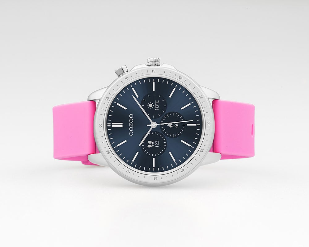 Die Q00314 mit rundem Design aus der OOZOO Smartwatches-Kollektion ist unisex und die intelligente Lösung für alle. Diese Uhr ist ein einzigartiges Modestatement mit ihrem pinkfarbenen Silikon-Armband. Diese Smartwatch hat ein silbernes Metallgehäuse mit einem Durchmesser von 45 mm. Für die Smartwatch stehen verschiedene Original-OOZOO-Zifferblätter zur Auswahl. Diese Uhr ist IP67-zertifiziert und nickelsicher.