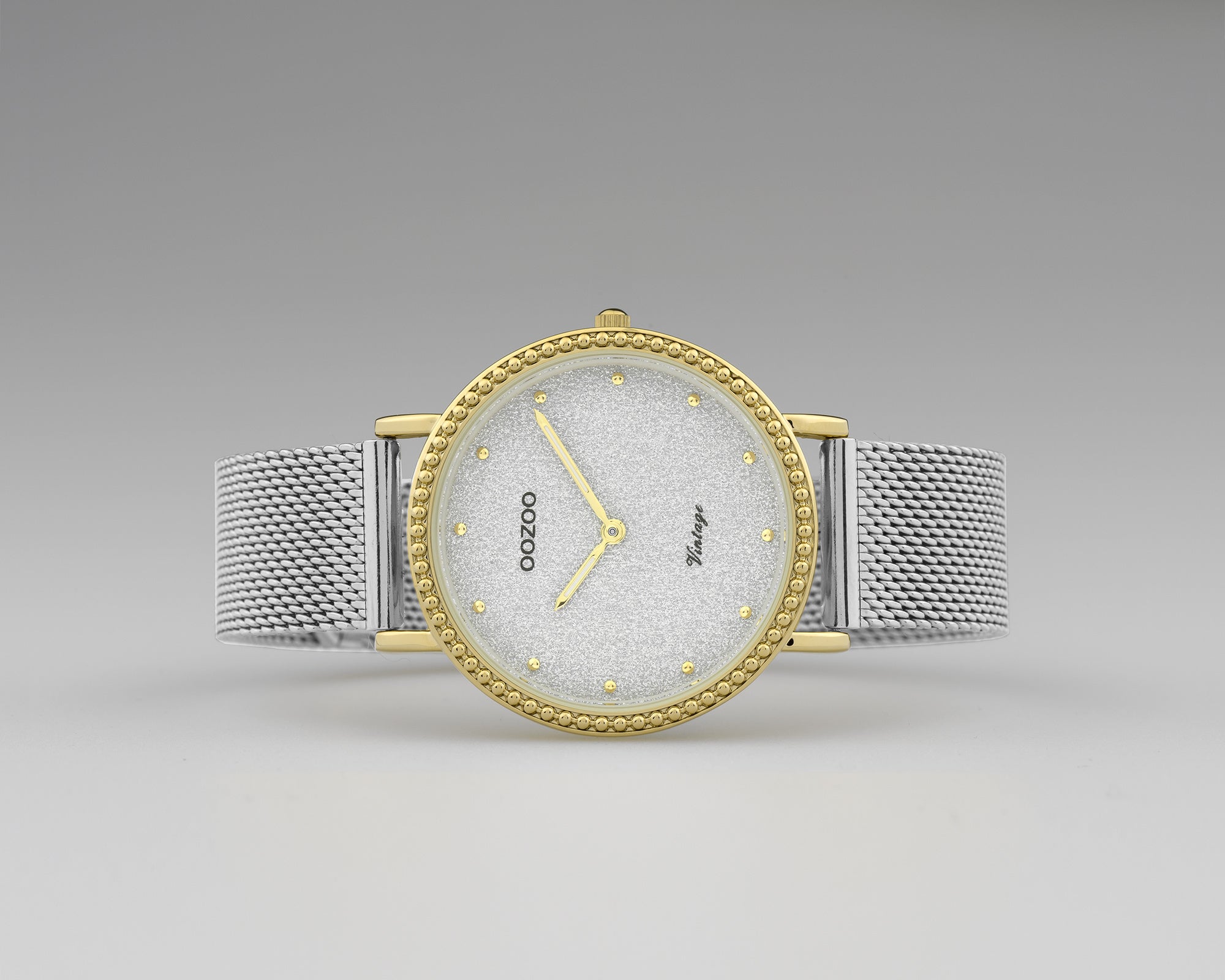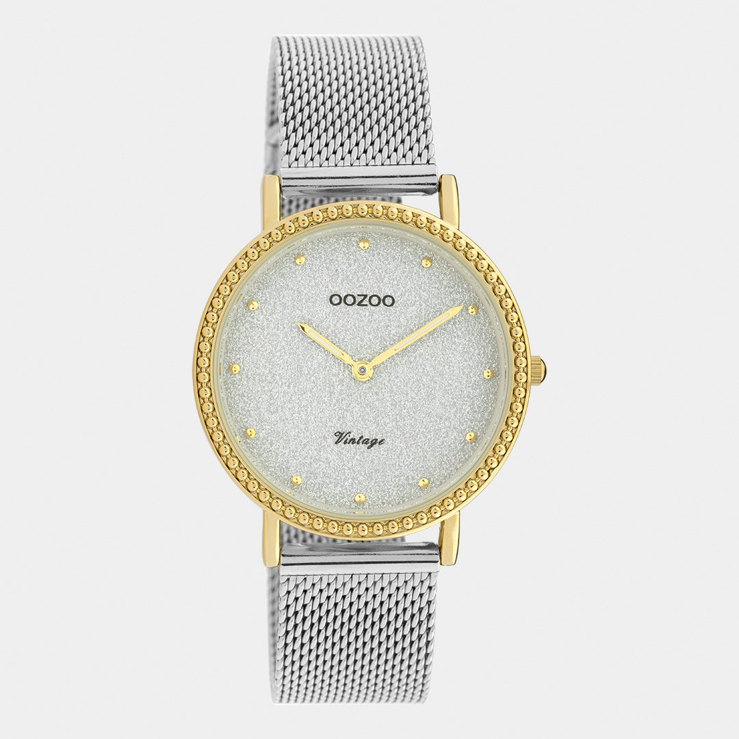 Raffinesse und Eleganz sind zwei Elemente dieser wunderschönen OOZOO Vintage-Serie. Dieses klassische runde Design der C20053 passt für jeden. Diese Damenuhr ist mit ihrem goldenen Metallgehäuse ø34mm angenehm zu tragen. Das goldene Mesh-Armband mit Schiebeverschluss macht diese Uhr zu einem Klassiker aller Zeiten, den Sie zu jedem Anlass tragen können. Das glitzernde Zifferblatt ist mit den goldenen Index Punkten versehen. Dieses Modell ist mit einem japanischen Markenuhrwerk ausgestattet. Außerdem ist die Uhr spritzwassergeschützt, nickelfrei und hat einen Gehäuseboden aus Edelstahl.