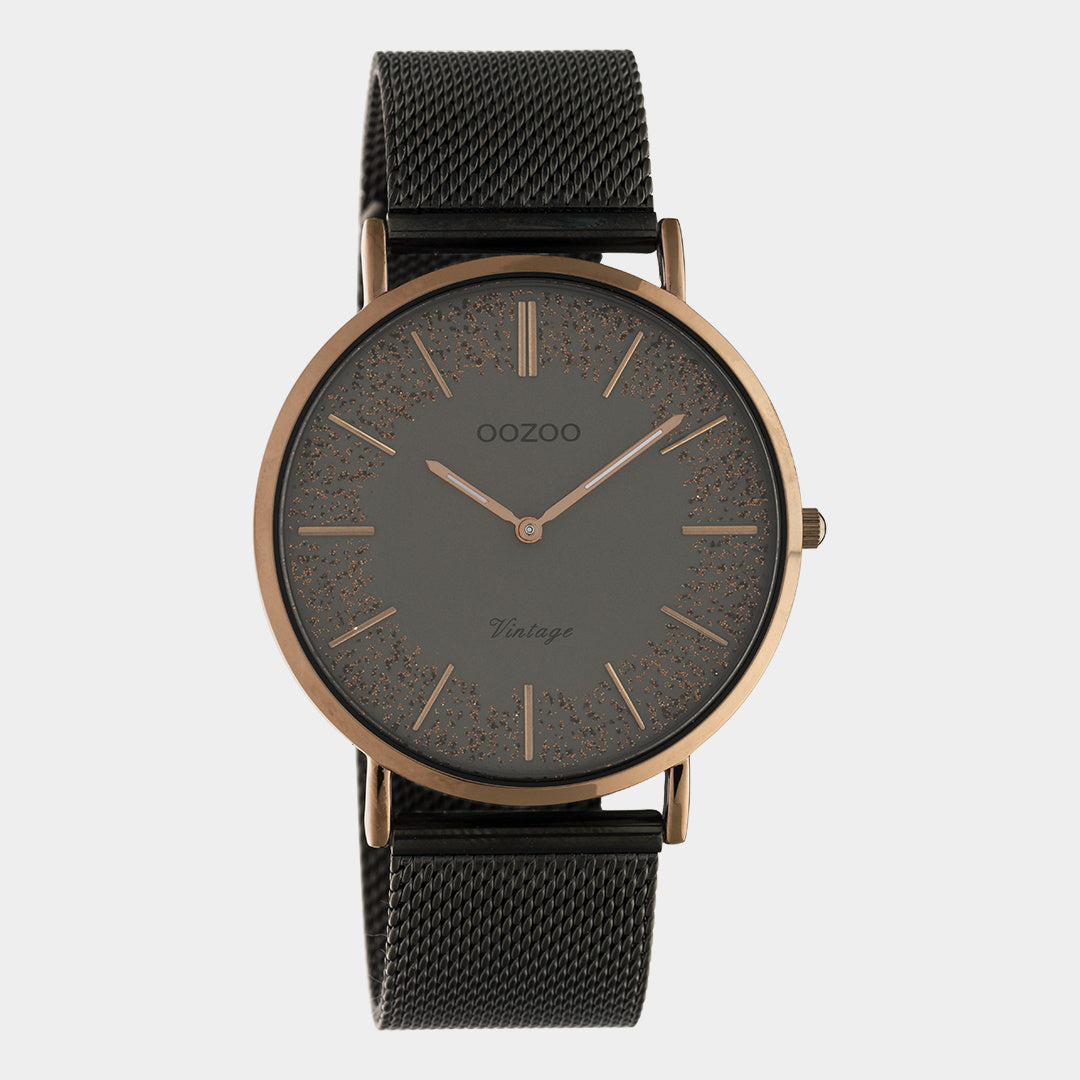 Raffinesse und Eleganz sind zwei Elemente dieser wunderschönen OOZOO Vintage-Serie. Dieses klassische runde Design der C20139 passt für jeden. Diese Damen-Uhr ist mit ihrem braunen Metallgehäuse ø40mm angenehm zu tragen. Das schwarze Mesh-Armband mit Schiebeverschluss macht diese Uhr zu einem Klassiker aller Zeiten, den Sie zu jedem Anlass tragen können. Dieses Modell ist mit einem japanischen Markenuhrwerk ausgestattet. Außerdem ist die Uhr spritzwassergeschützt, nickelfrei und hat einen Gehäuseboden aus Edelstahl.