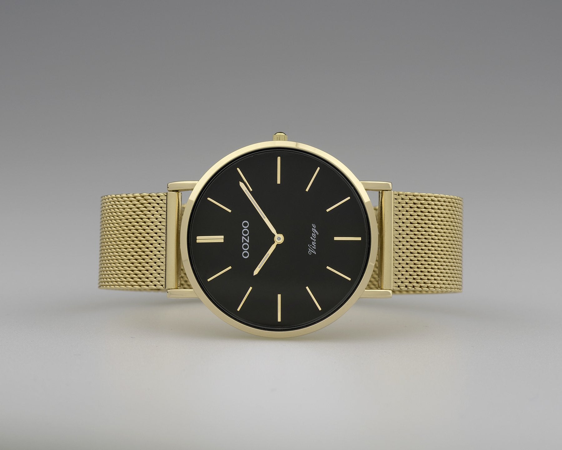 Raffinesse und Eleganz sind zwei Elemente dieser wunderschönen OOZOO Vintage-Serie. Dieses klassische runde Design der C9915 passt für jeden. Diese Unisex-Uhr ist mit ihrem goldenen Metallgehäuse ø32mm und dem schwarzen Zifferblatt angenehm zu tragen. Das goldene Mesh-Armband mit Schiebeverschluss macht diese Uhr zu einem Klassiker aller Zeiten, den Sie zu jedem Anlass tragen können. Das Zifferblatt hat golden gestreifte Ziffern und passende Zeiger. Dieses Modell ist mit einem japanischen Markenuhrwerk ausgestattet. Außerdem ist die Uhr spritzwassergeschützt, nickelfrei und hat einen Gehäuseboden aus Edelstahl.