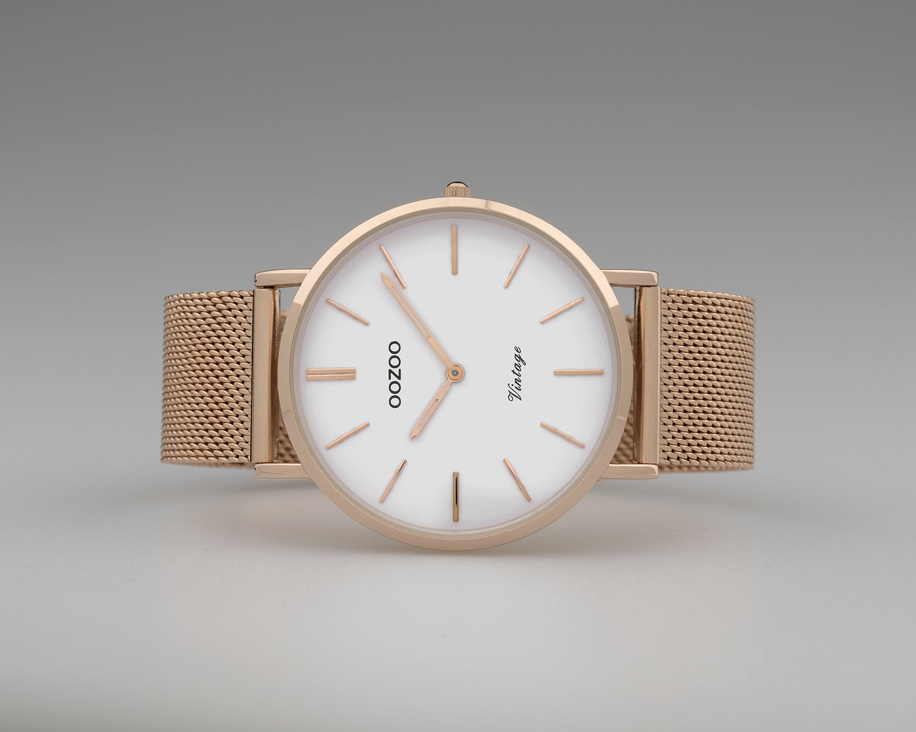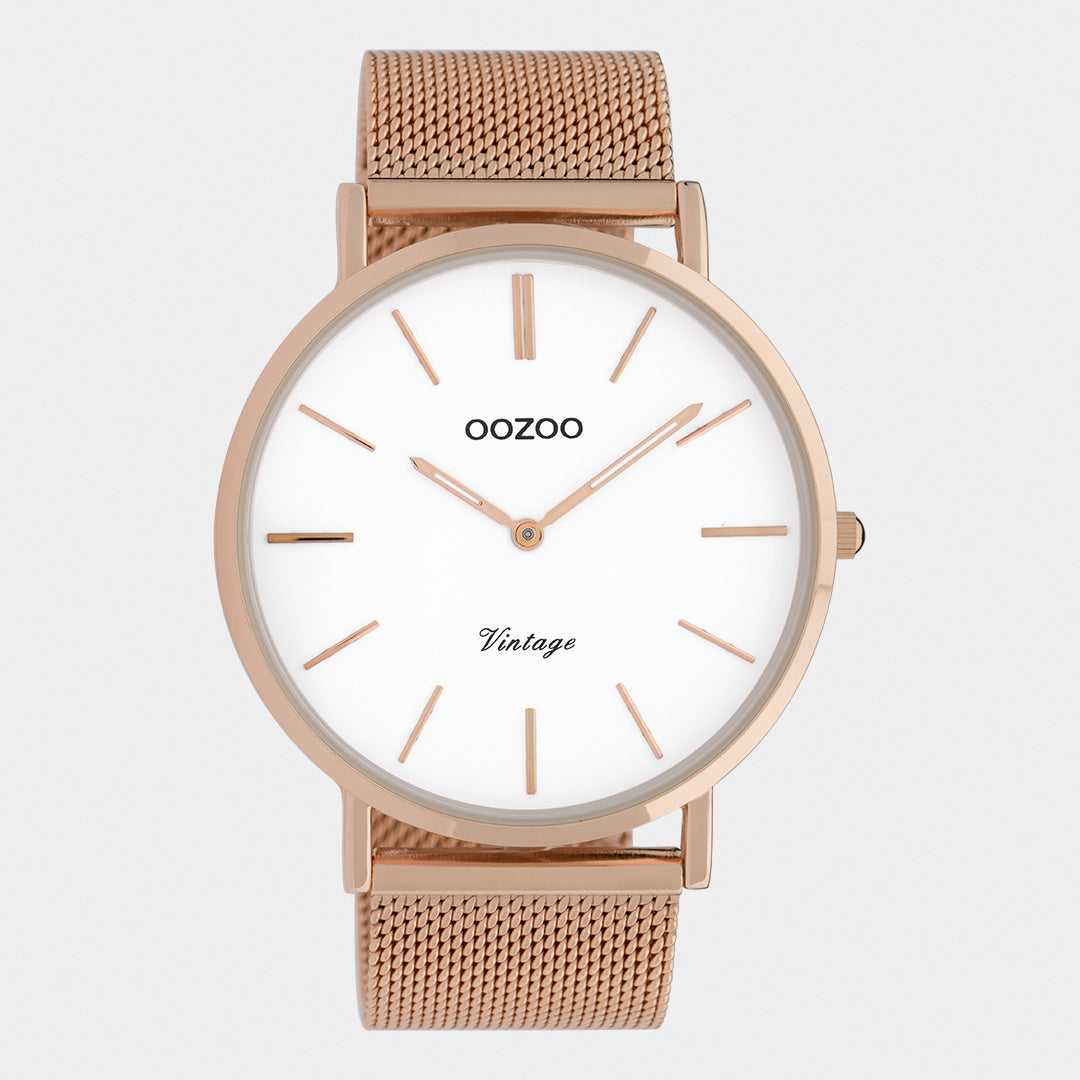 Raffinesse und Eleganz sind zwei Elemente dieser wunderschönen OOZOO Vintage-Serie. Dieses klassische runde Design der C9916 passt für jeden. Diese Unisex-Uhr ist mit ihrem roségoldenen Metallgehäuse ø44mm und dem weißen Zifferblatt angenehm zu tragen. Das roségoldene Mesh-Armband mit Schiebeverschluss macht diese Uhr zu einem Klassiker aller Zeiten, den Sie zu jedem Anlass tragen können. Das Zifferblatt hat roségolden gestreifte Ziffern und passende Zeiger. Dieses Modell ist mit einem japanischen Markenuhrwerk ausgestattet. Außerdem ist die Uhr spritzwassergeschützt, nickelfrei und hat einen Gehäuseboden aus Edelstahl.