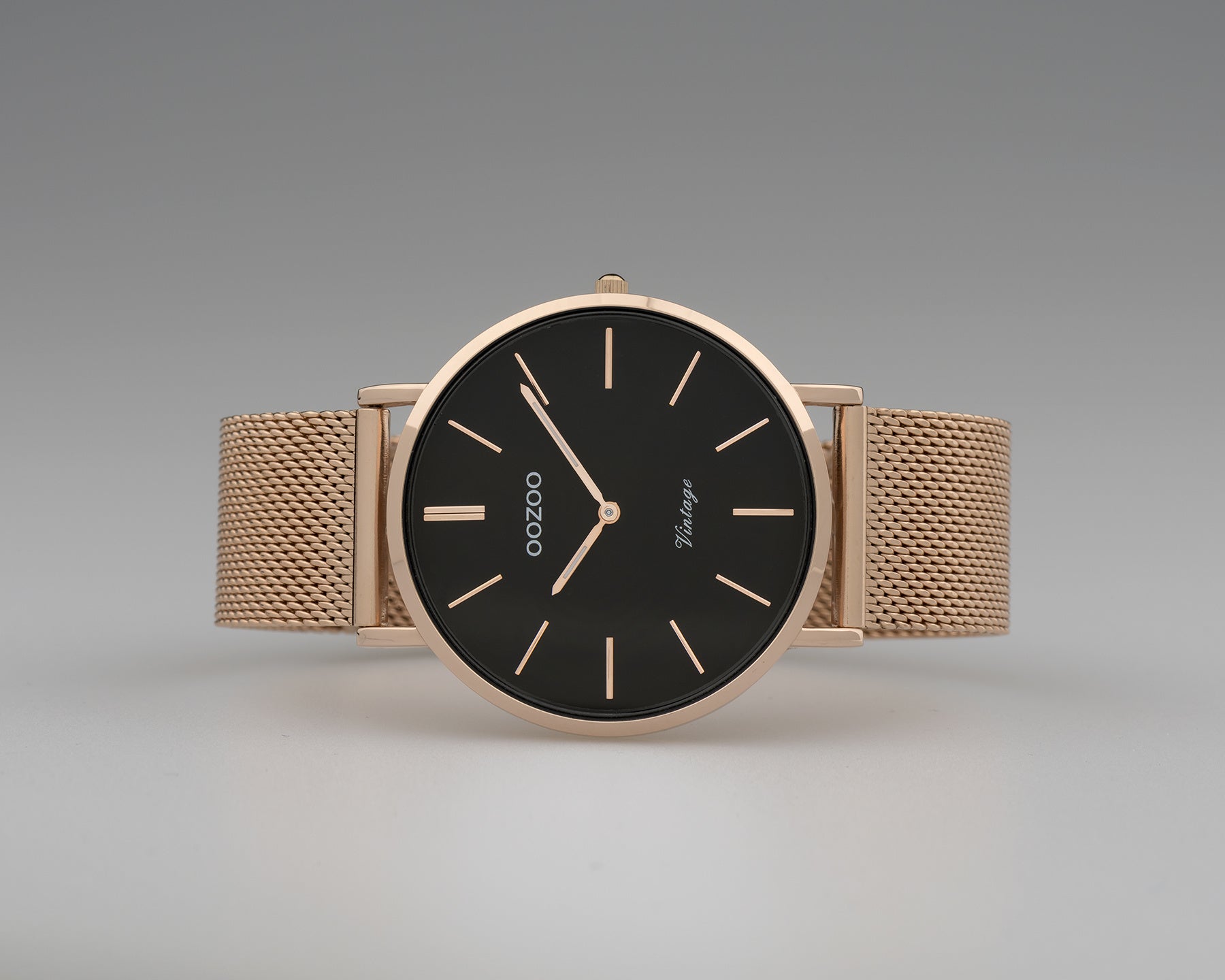 Raffinesse und Eleganz sind zwei Elemente dieser wunderschönen OOZOO Vintage-Serie. Dieses klassische runde Design der C9926 passt für jeden. Diese Unisex-Uhr ist mit ihrem roségoldenen Metallgehäuse ø36mm und dem schwarzen Zifferblatt angenehm zu tragen. Das roséfarbene Mesh-Armband mit Schiebeverschluss macht diese Uhr zu einem Klassiker aller Zeiten, den Sie zu jedem Anlass tragen können. Das Zifferblatt hat roségolden gestreifte Ziffern und passende Zeiger. Dieses Modell ist mit einem japanischen Markenuhrwerk ausgestattet. Außerdem ist die Uhr spritzwassergeschützt, nickelfrei und hat einen Gehäuseboden aus Edelstahl.