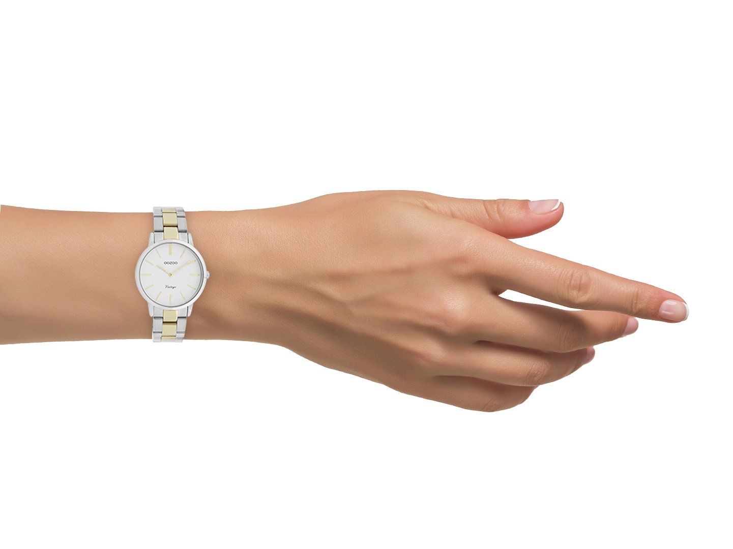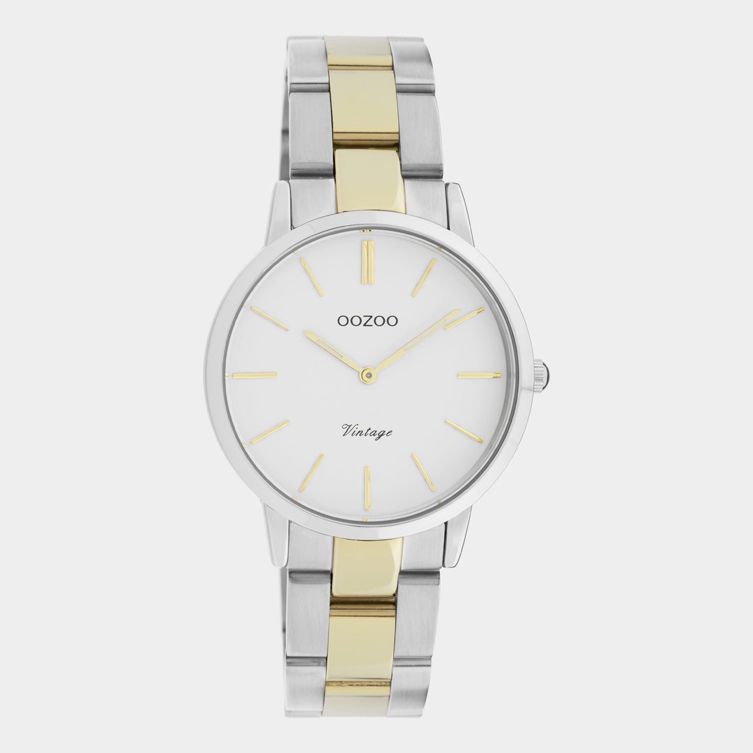 Für das neue Jahrzehnt haben wir die Next Generation-Kollektion als Erweiterung der OOZOO Vintage-Serie kreiert. Bei diesem klassische runde Design C20044 mit einem zeitgemäßen Touch ist für jeden etwas dabei. Diese Damenuhr ist die perfekte Kombination aus Komfort und Eleganz mit ihrem 34mm Gehäuse aus silbernem Metall und dem weißen Zifferblatt. Diese Uhr ist ein Muss für jeden Tragekomfort! Das Bicolor Edelstahlarmband mit mattem Glanz macht diese Uhr zu einem Alltimer, den Sie im nächsten Jahrzehnt noch tragen können. Das Zifferblatt hat goldgestreifte Ziffern und passende Zeiger. Dieses Modell ist mit einem japanischen Markenuhrwerk ausgestattet. Außerdem ist die Uhr spritzwassergeschützt, nickelfrei und hat einen Gehäuseboden aus Edelstahl.