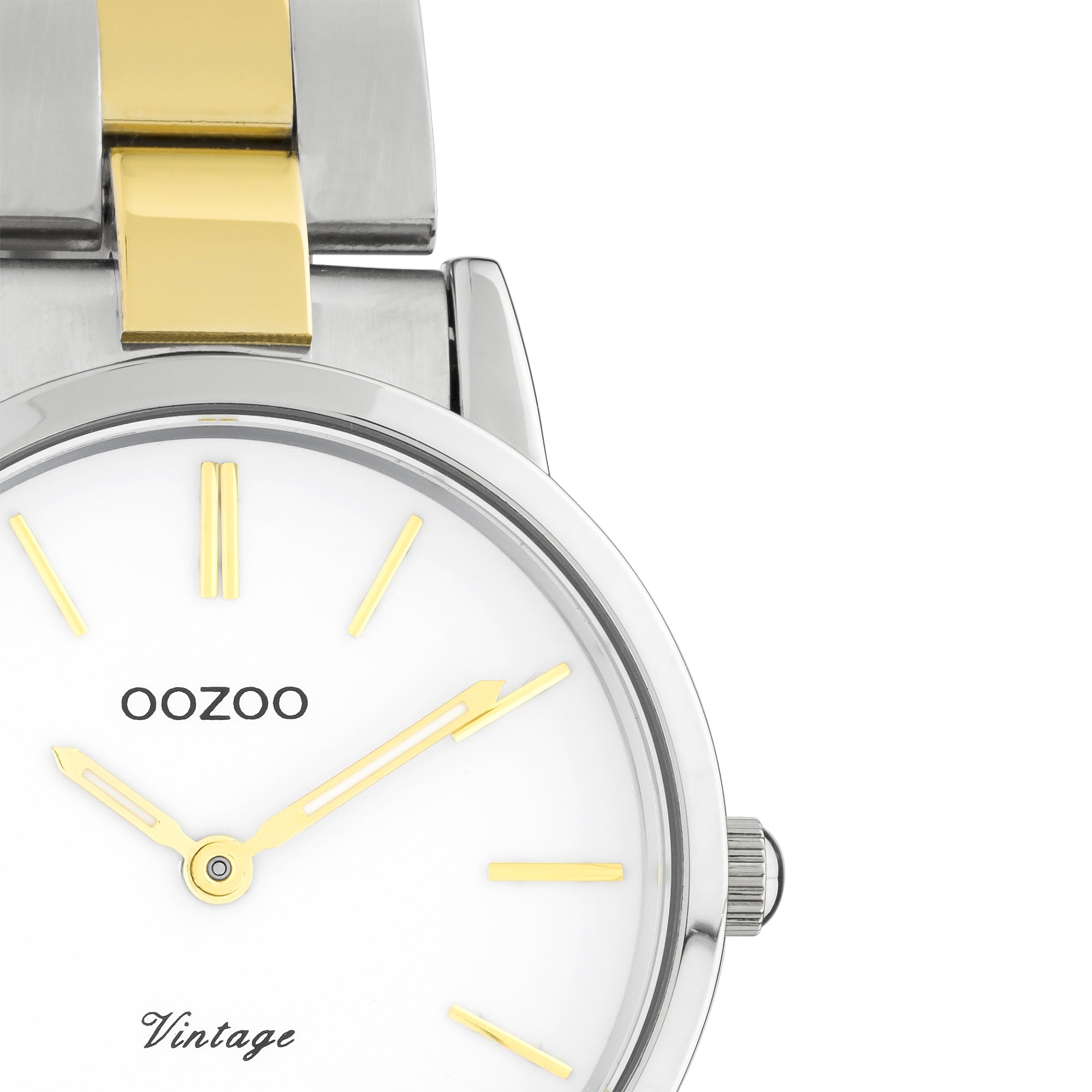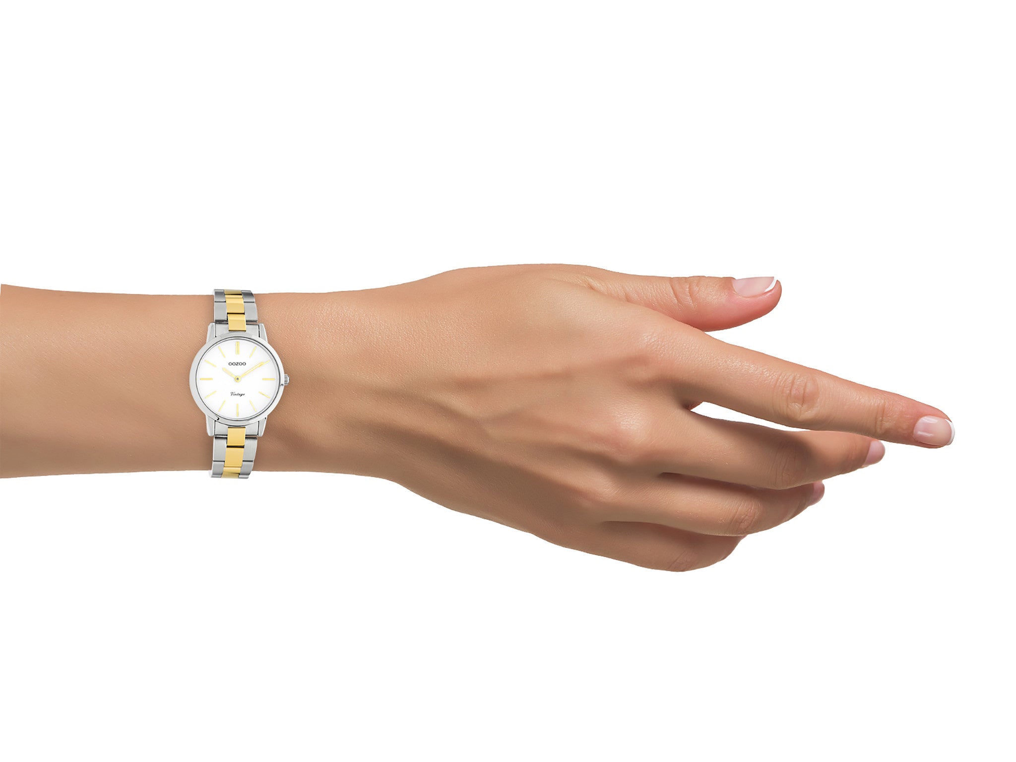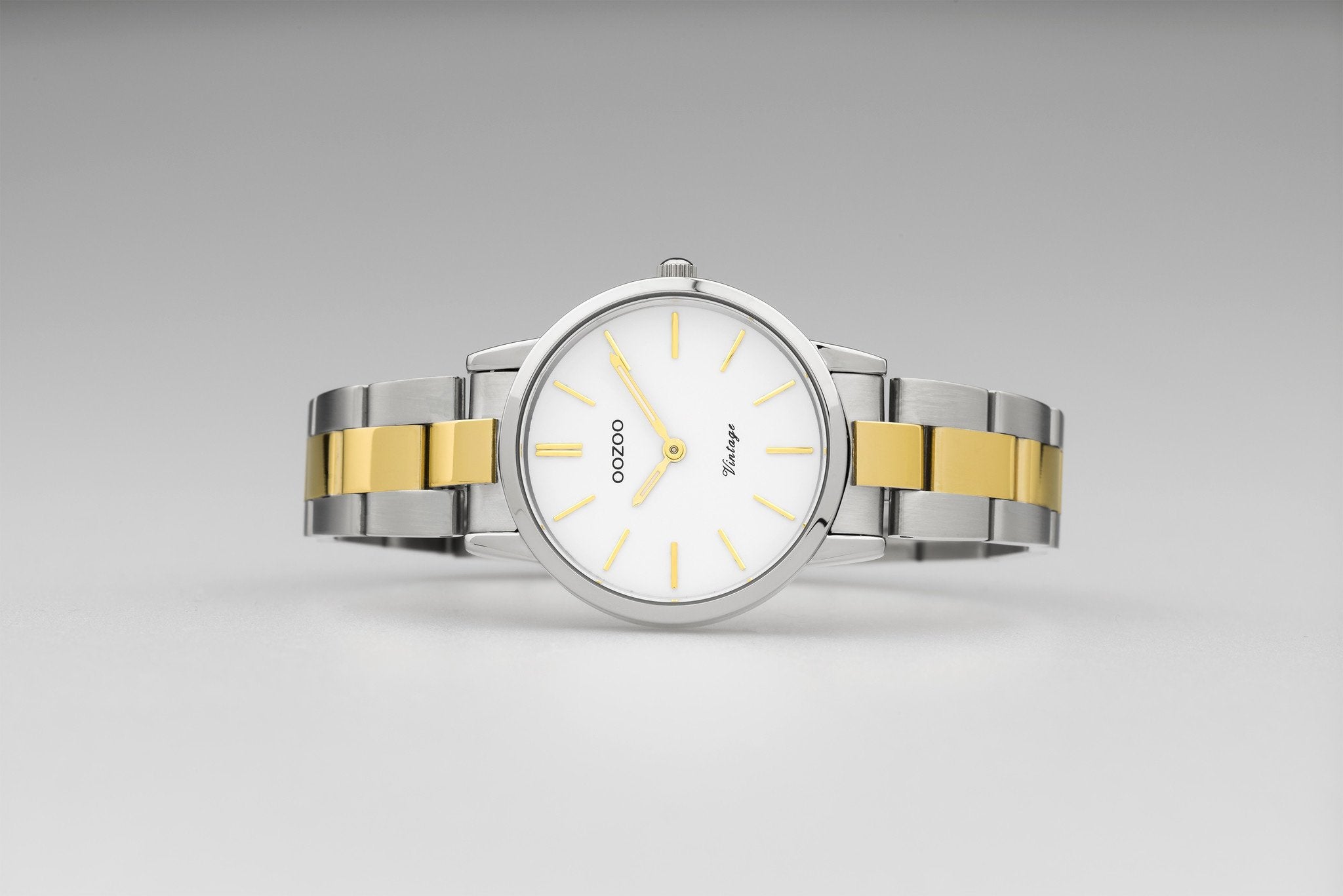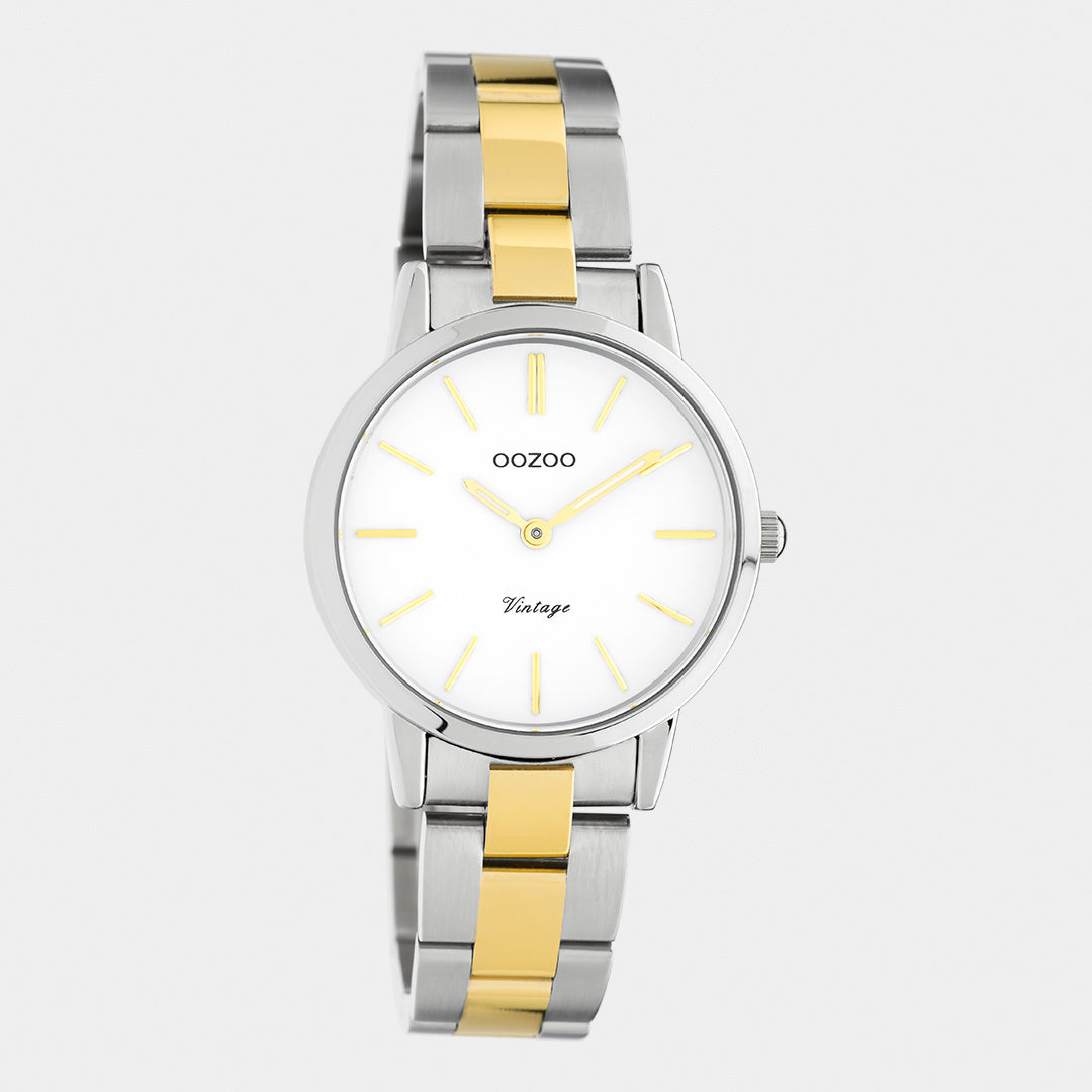 Für das neue Jahrzehnt haben wir die Next Generation-Kollektion als Erweiterung der OOZOO Vintage-Serie kreiert. Bei diesem klassische runde Design C20112 mit einem zeitgemäßen Touch ist für jeden etwas dabei. Diese Damenuhr ist die perfekte Kombination aus Komfort und Eleganz mit ihrem 30mm-Gehäuse aus Metall und dem weißen Zifferblatt. Diese Uhr ist ein Muss für jeden Tragekomfort! Das Bicolor Edelstahlarmband mit mattem Glanz macht diese Uhr zu einem Alltimer, den Sie im nächsten Jahrzehnt noch tragen können. Das Zifferblatt hat goldgestreifte Ziffern und passende Zeiger. Dieses Modell ist mit einem japanischen Markenuhrwerk ausgestattet. Außerdem ist die Uhr spritzwassergeschützt, nickelfrei und hat einen Gehäuseboden aus Edelstahl.