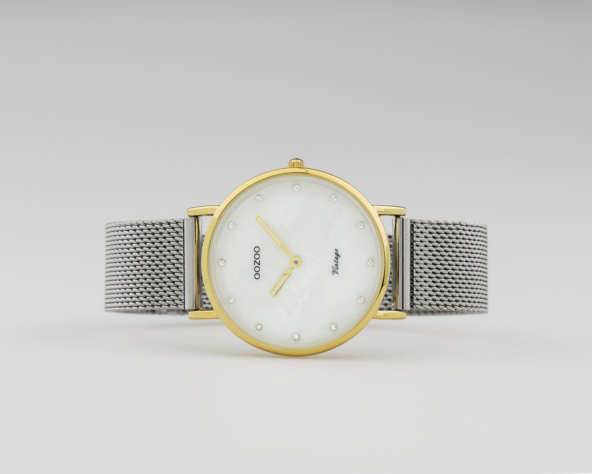 Raffinesse und Eleganz sind zwei Elemente dieser wunderschönen OOZOO Vintage-Serie. Dieses klassische runde Design der C20120 passt für jeden. Diese Damenuhr ist mit ihrem goldenen Metallgehäuse ø32mm angenehm zu tragen. Das silberne Mesh-Armband mit Schiebeverschluss macht diese Uhr zu einem Klassiker aller Zeiten, den Sie zu jedem Anlass tragen können. Die Uhr hat ein Perlmutfarbenes Zifferblatt. Dieses Modell ist mit einem japanischen Markenuhrwerk ausgestattet. Außerdem ist die Uhr spritzwassergeschützt, nickelfrei und hat einen Gehäuseboden aus Edelstahl.