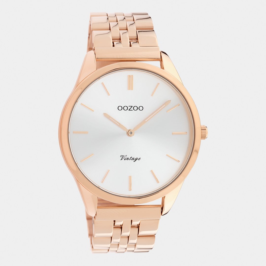 Für das neue Jahrzehnt haben wir die Next Generation-Kollektion als Erweiterung der OOZOO Vintage-Serie kreiert. Bei diesem klassische runde Design der C9988 mit einem zeitgemäßen Touch ist für jeden etwas dabei. Diese Damenuhr ist die perfekte Kombination aus Komfort und Eleganz mit ihrem 38mm-Gehäuse aus Roségoldenen Metall und dem silbernen Zifferblatt. Diese Uhr ist ein Muss für jeden Tragekomfort! Das Roségoldene Edelstahlarmband mit mattem Glanz macht diese Uhr zu einem Alltimer, den Sie im nächsten Jahrzehnt noch tragen können. Das Zifferblatt hat roségestreifte Ziffern und passende Zeiger. Dieses Modell ist mit einem japanischen Markenuhrwerk ausgestattet. Außerdem ist die Uhr spritzwassergeschützt, nickelfrei und hat einen Gehäuseboden aus Edelstahl.